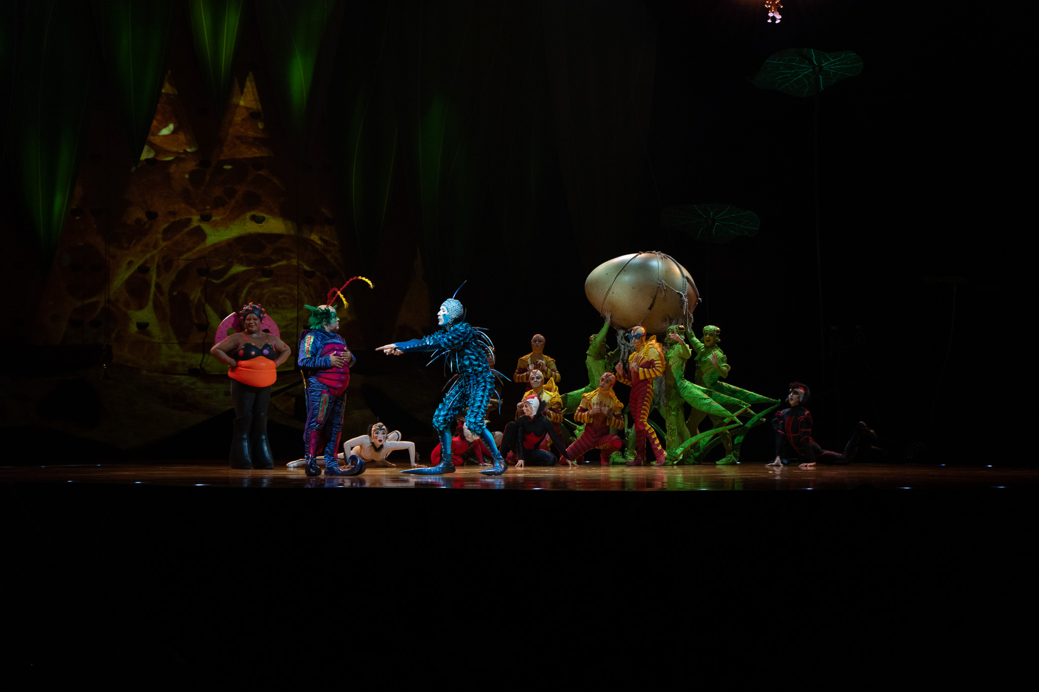En el escenario, una colonia de insectos vive un día lleno de descubrimientos, coreografías y acrobacias impresionantes. Grillos que saltan con fuerza sobre trampolines, mariposas que se deslizan en el aire con elegancia, hormigas que hacen malabares con precisión y arañas que se contorsionan desafiando la gravedad.