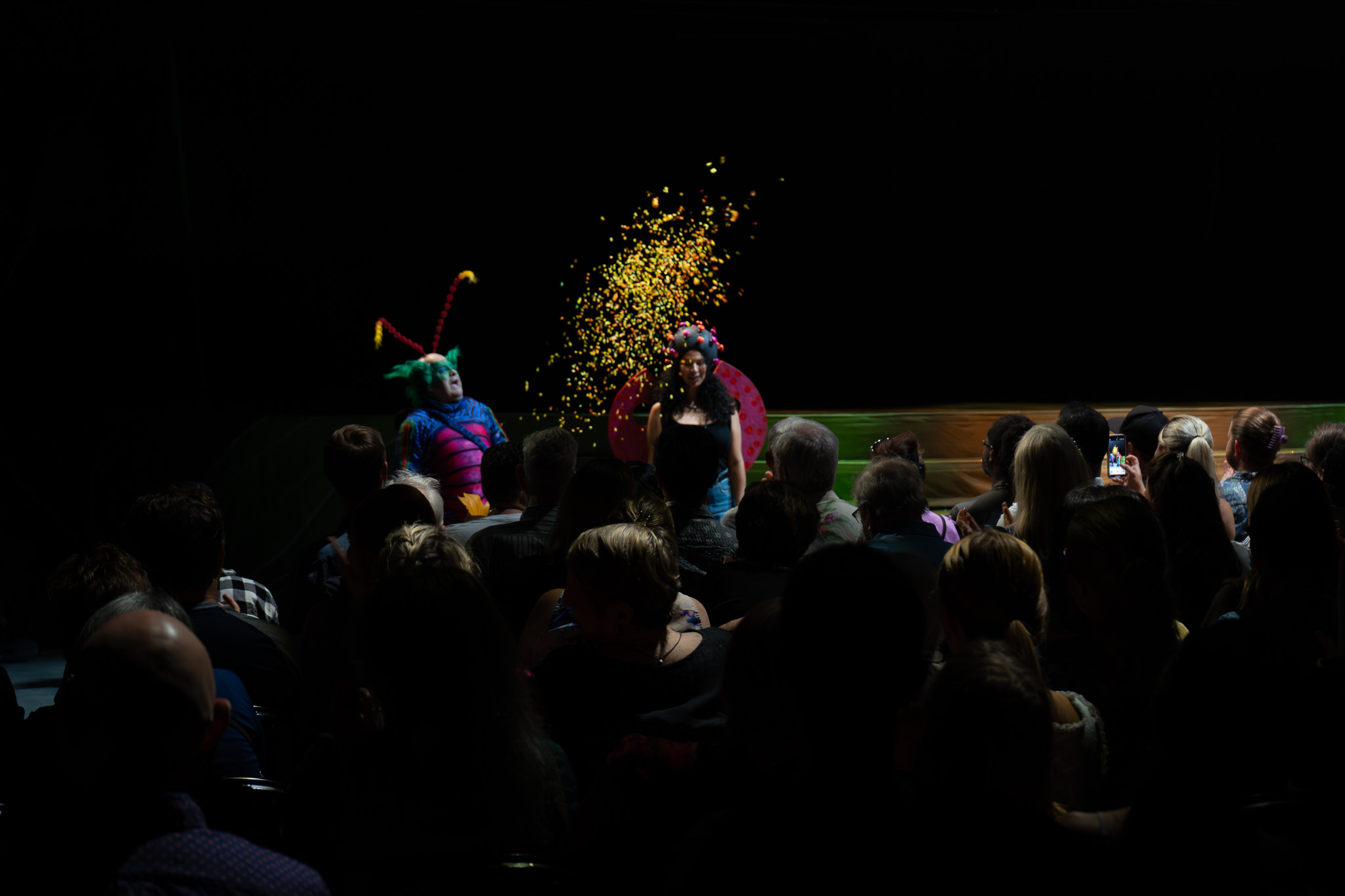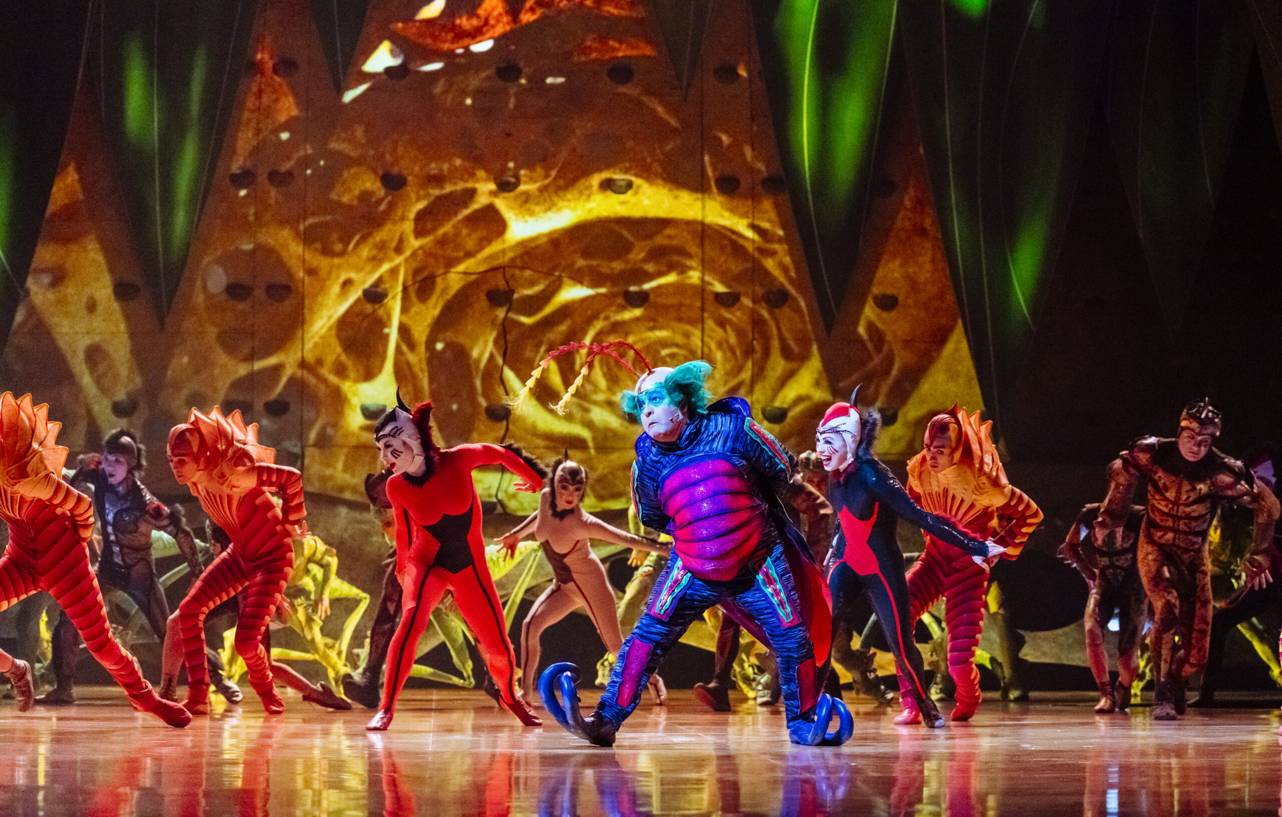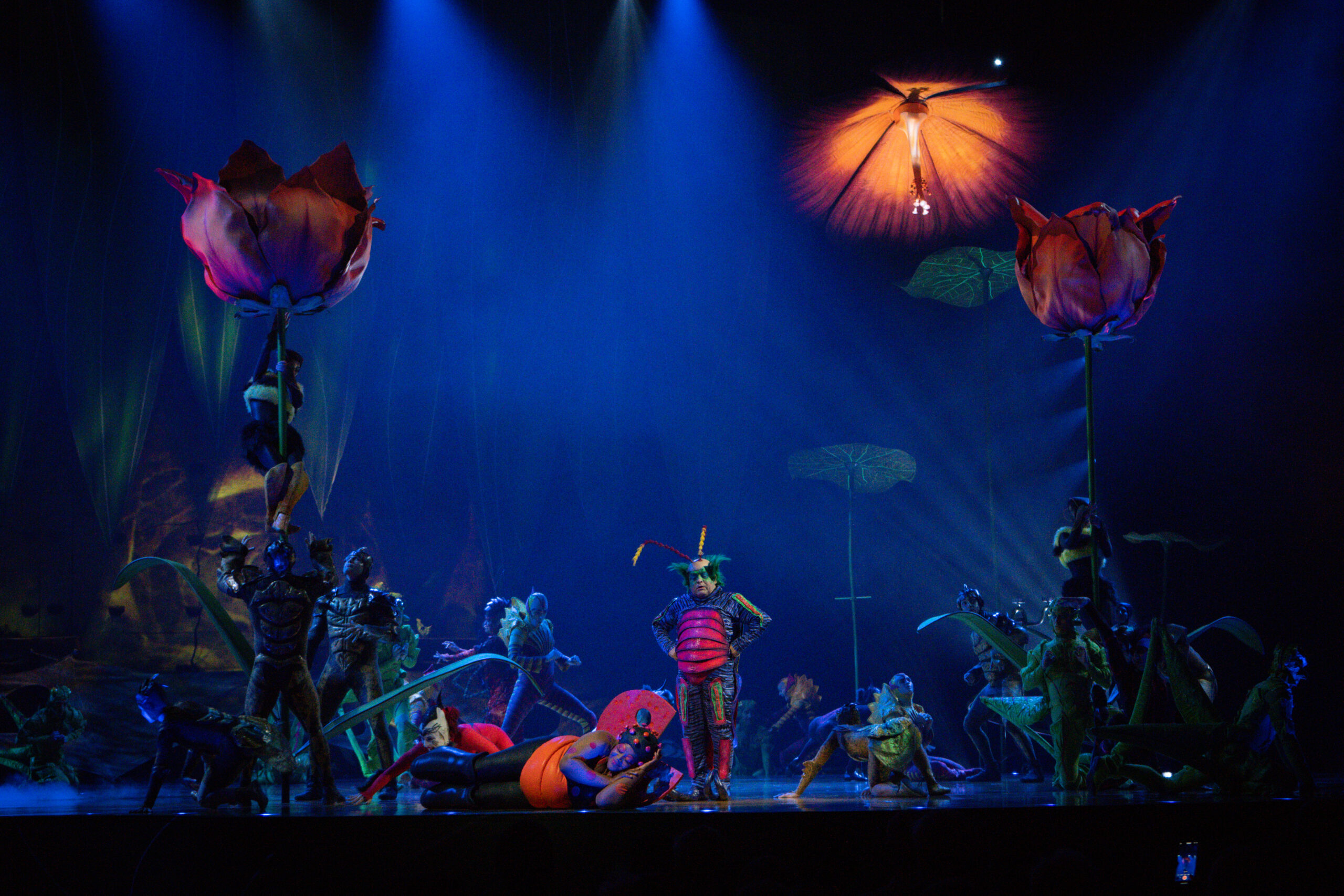 En el escenario, una colonia de insectos vive un día lleno de descubrimientos, coreografías y acrobacias impresionantes. Grillos que saltan con fuerza sobre trampolines, mariposas que se deslizan en el aire con elegancia, hormigas que hacen malabares con precisión y arañas que se contorsionan desafiando la gravedad.